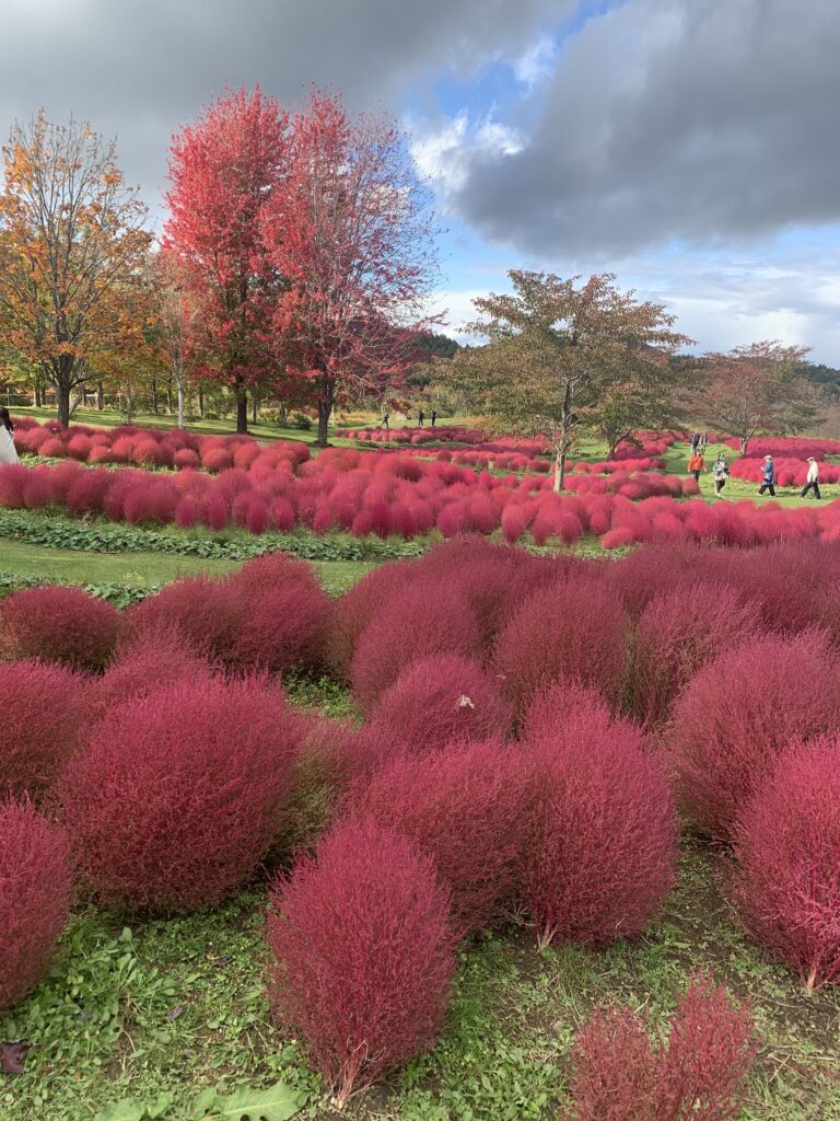 昼食後は、今回の旅行のメインイベント『ゆにガーデン』で 32,000 株の真っ赤なコキアの紅葉を鑑賞。コキアの赤と芝生の緑、空の青と雲の白のコントラストが素晴らしく皆さん「うわ~!」と思わず声が出てしまうほどの美しい 絶景でした。広い園内、「コキアの広場」や「コキアの丘」で映え写真を撮ったり、散策しながら素晴らしい風景を堪能いただきました。