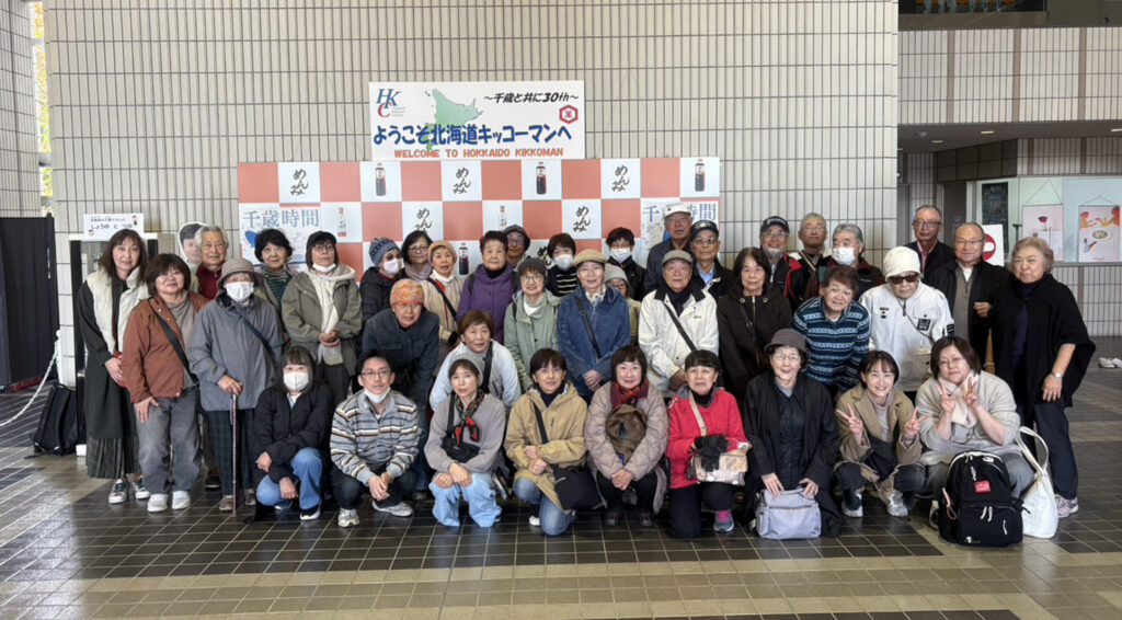 9時30分に西野第二町内会館を出発し、初めに『キッコーマン工場』で醤油の製造工程を見学。ふだん使っている醤油がどのようにできているのかビデオや工場を回りながら学び、見学終了時には「搾りたて生しょうゆ」を記念にいただきました。ランチタイムには長沼温泉の別棟『ひつじの旅』で「かねひろジンギスカン」をいただきましたが、生姜の効いたつけダレで柔らかく絶品で帰りにはご自宅用に買い求める方もいらっしゃいました。